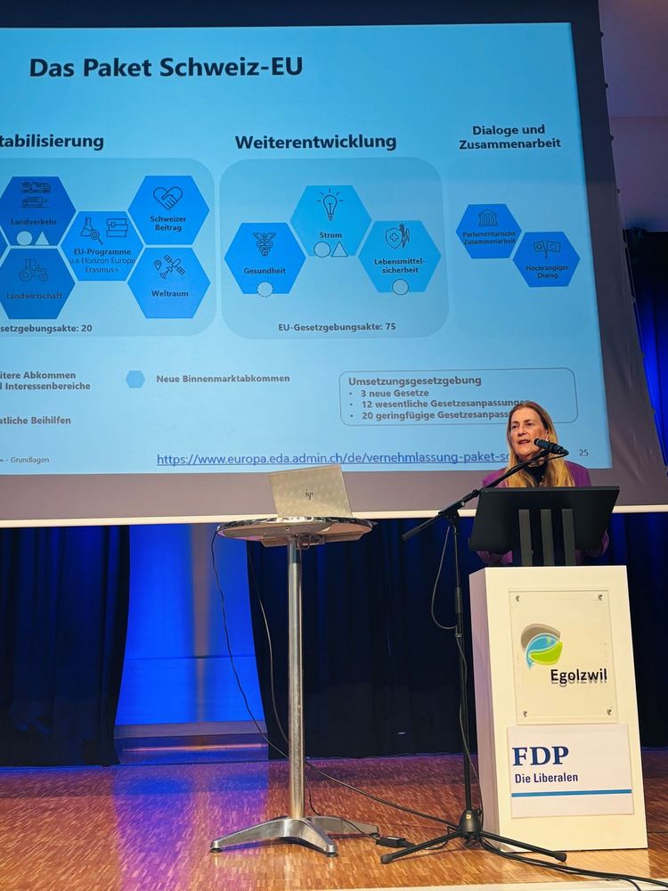 In ihrem Referat beleuchtete Helene Budliger Artieda die enge wirtschaftliche und gesellschaftliche Verflechtung der Schweiz mit der Europäischen Union. Sie betonte, dass die Schweiz als exportorientiertes Land auf verlässliche Rahmenbedingungen und den Zugang zum europäischen Binnenmarkt angewiesen sei.